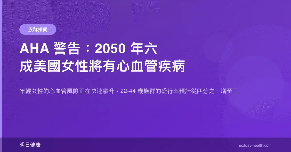 到 2050 年,將有將近六成的美國女性罹患某種形式的心血管疾病——這不是危言聳聽,而是美國心臟學會(AHA)基於流行病學趨勢提出的嚴肅預測。更令人擔憂的是,年輕女性的風險正在急速攀升:22 至 44 歲女性的心血管疾病盛行率預計從目前的四分之一上升至三分之一。如果你認為心臟病只是「老年男性的疾病」,這份報告會改變你的認知。
