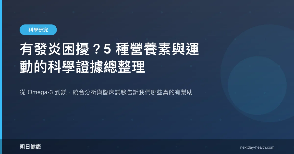 慢性低度發炎(chronic low-grade inflammation)是指體內促發炎因子長期處於輕微升高的狀態,與肥胖、心血管疾病、憂鬱症和自體免疫疾患密切相關。面對市場上琳琅滿目的抗發炎營養素,哪些擁有紮實的臨床證據支持?本文以 5 篇近期高品質研究為基礎,逐一檢視 Omega-3、薑黃素、維生素 D、鎂與運動的實證等級,幫助讀者區分「可能有效」與「證據不足」。