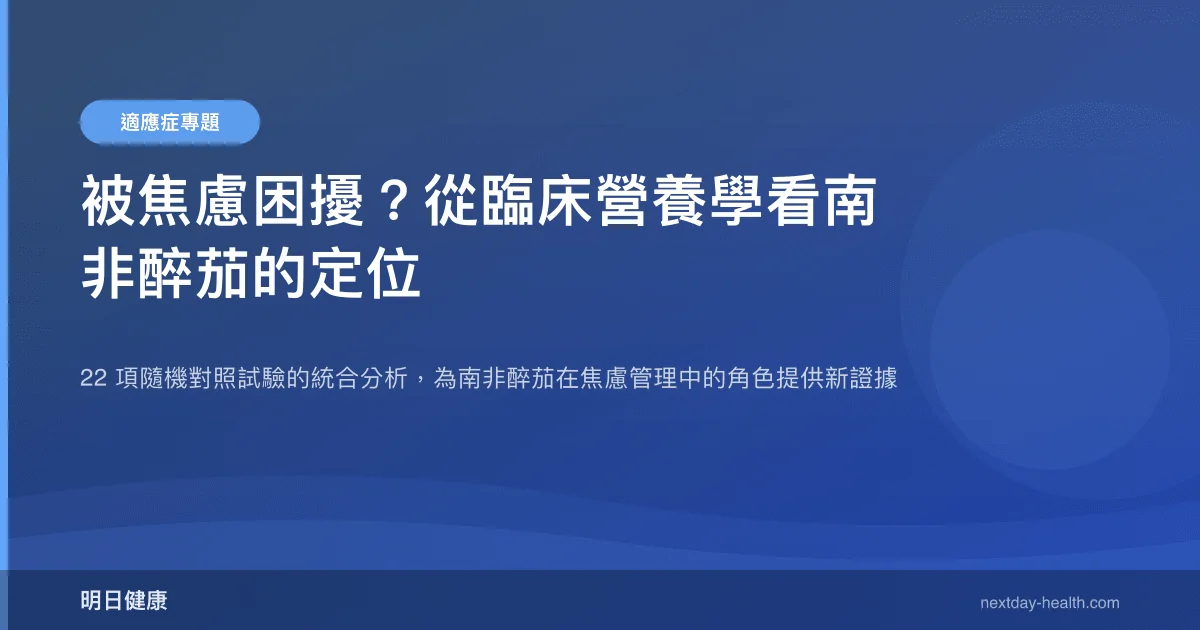 2026 年發表於《Complementary Therapies in Medicine》的一項大規模統合分析,納入了 22 項隨機對照試驗,是目前規模最大的南非醉茄心理健康效果回顧(Alsanie et al., PMID: 41644067)。分析結果顯示,南非醉茄補充可顯著改善受試者的壓力、焦慮與憂鬱症狀。