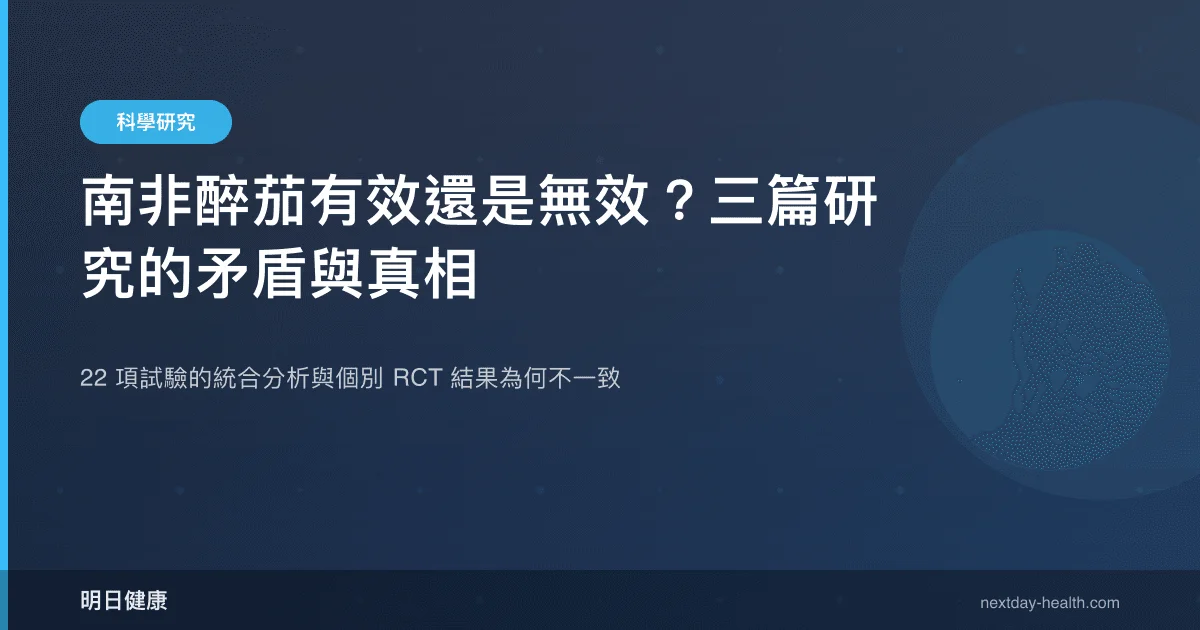 Alsanie 等人(2026)納入 22 項隨機對照試驗進行劑量反應統合分析,結果顯示南非醉茄對壓力、焦慮與憂鬱症狀均有顯著改善效果。南非醉茄是指印度傳統醫學中使用的茄科植物 Withania somnifera,其根部萃取物含有活性成分 withanolides。然而,該分析同時指出研究間異質性偏高,意味著各試驗的設計、劑量、受試者條件差異很大,整體結論的精確度因此打了折扣。