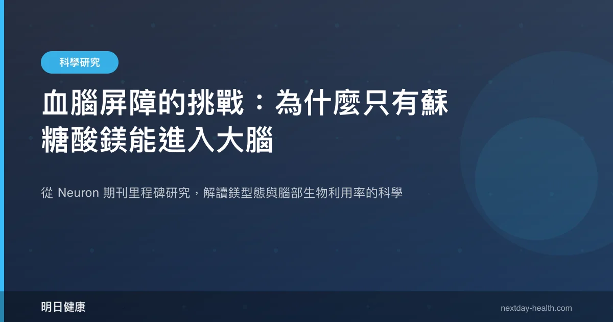 鎂參與人體超過 300 種酵素反應,是維持神經訊號傳導的核心礦物質(Kumar et al., 2024)。然而,大腦被一道極為嚴密的防線——血腦屏障(Blood-Brain Barrier, BBB)所保護,絕大多數口服鎂補充劑無法有效穿越這道屏障進入腦組織。這意味著即使血液中的鎂濃度正常,腦內鎂含量仍可能不足,進而影響認知功能與神經健康。