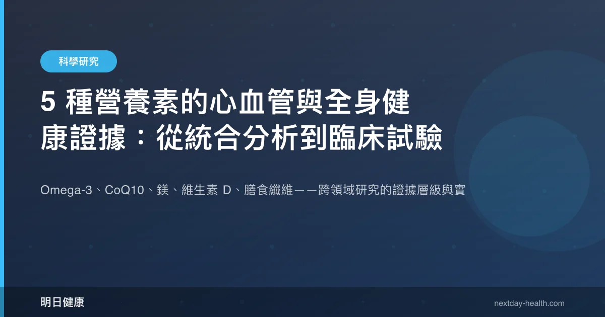 心血管疾病仍是全球首要死因,而營養補充是否能提供額外保護,持續是臨床研究的焦點。2024 至 2026 年間發表的五篇系統性回顧與臨床試驗,分別從 Omega-3、輔酶 Q10(CoQ10)、鎂、維生素 D 與膳食纖維切入,提供了不同證據層級的發現。本文以證據等級為軸線,彙整這些營養素在心血管及相關健康領域的最新研究結果。