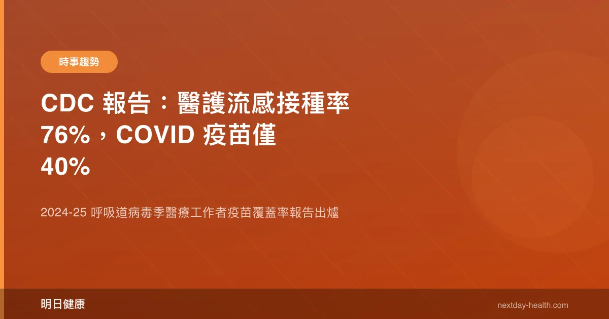 美國疾病管制與預防中心(CDC)於 2026 年 4 月 2 日發布 2024-25 呼吸道病毒季的醫療工作者疫苗接種覆蓋率報告:流感疫苗接種率為 76.3%,而 COVID-19 疫苗接種率僅 40.2%,兩者差距顯著。