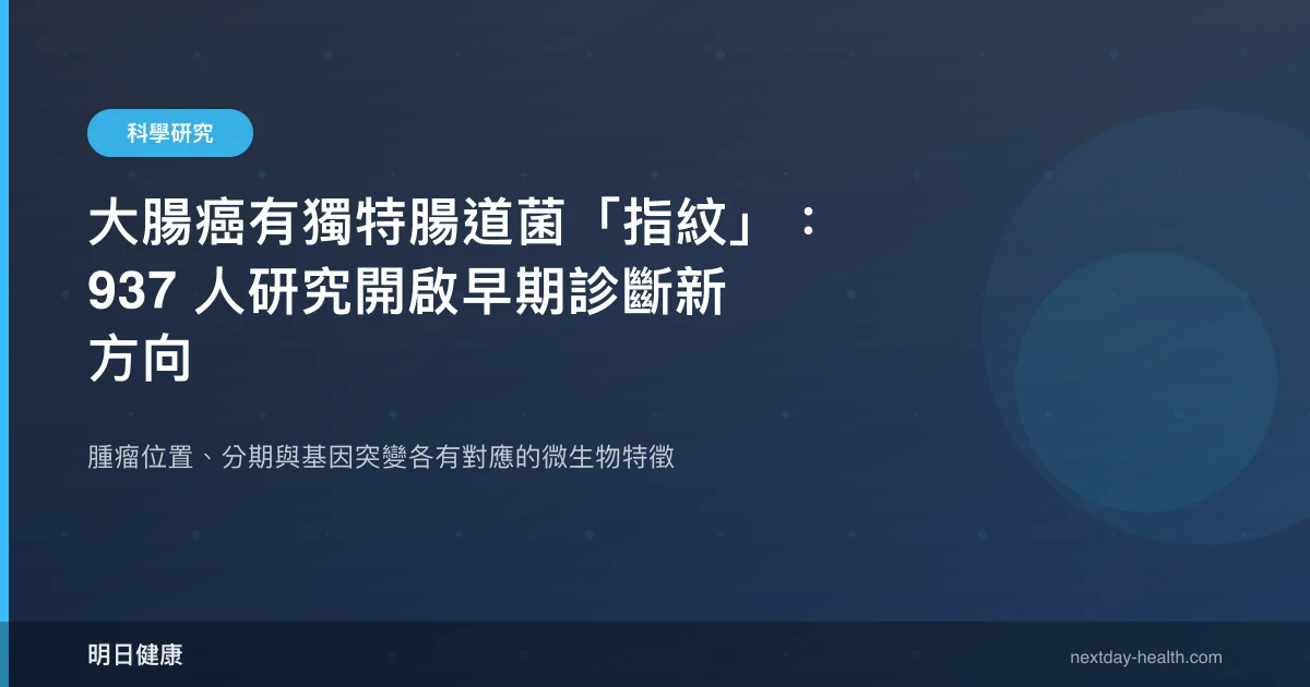 一項發表於《Nature Communications》、涵蓋 937 名患者的大型研究發現,大腸癌組織中攜帶獨特的微生物特徵,不同腫瘤位置、分期和基因突變狀態都有各自對應的腸道菌「指紋」,這項發現可能為非侵入性的早期大腸癌篩檢開啟新方向。
