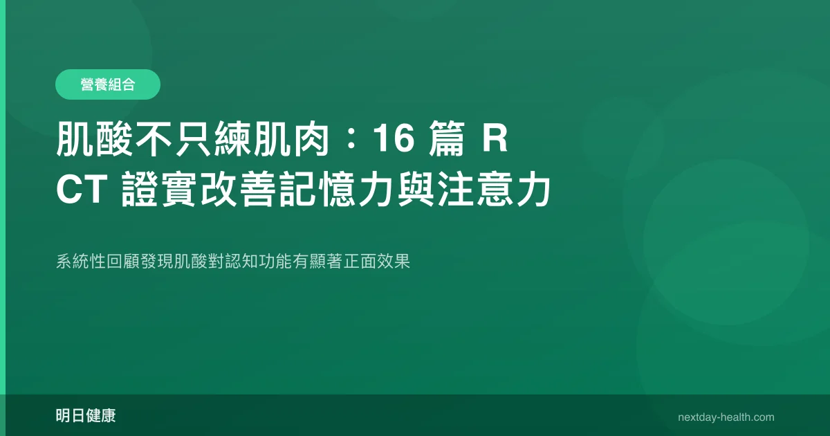 - 系統性回顧整合 16 篇 RCT、492 名受試者(20-76 歲),發現肌酸顯著改善記憶力和注意力