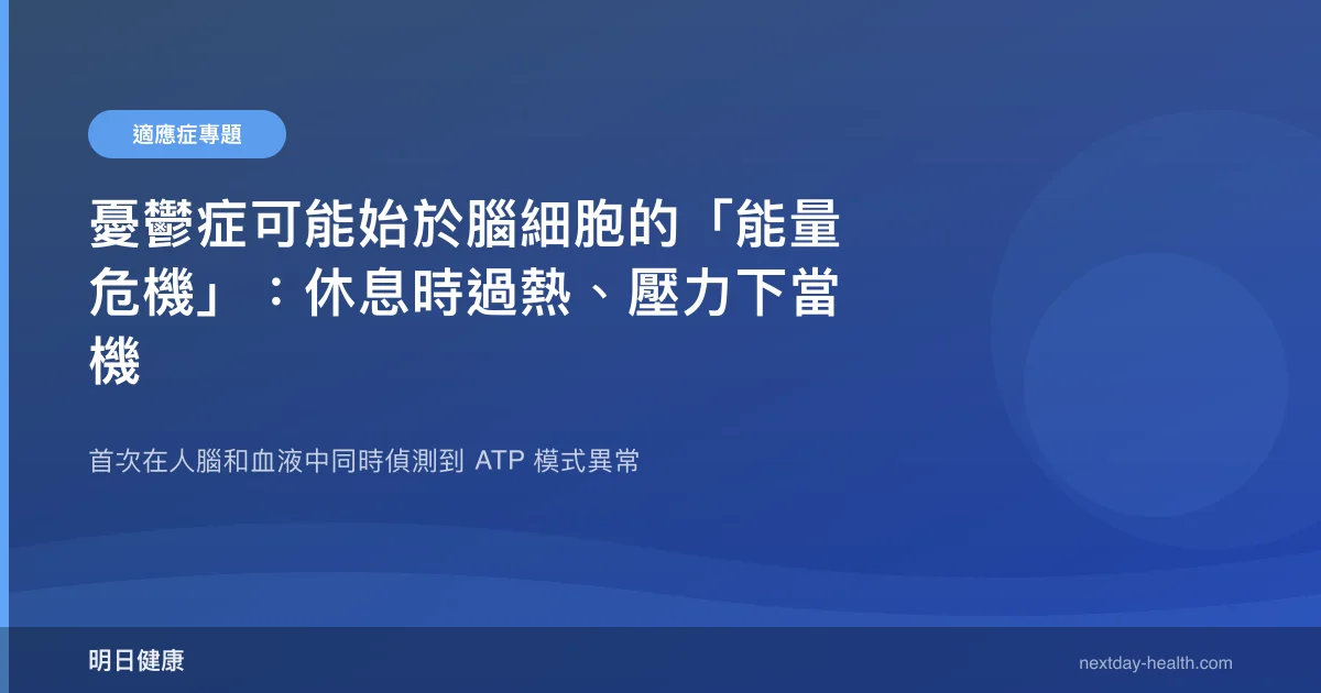 昆士蘭大學與明尼蘇達大學的研究團隊發現,憂鬱症患者的腦細胞存在獨特的能量異常模式——休息時 ATP 產生過高,但面對壓力時卻無法提升能量輸出。這是首次在年輕憂鬱症患者的大腦和血液中同時偵測到這種能量分子(ATP)的異常模式。