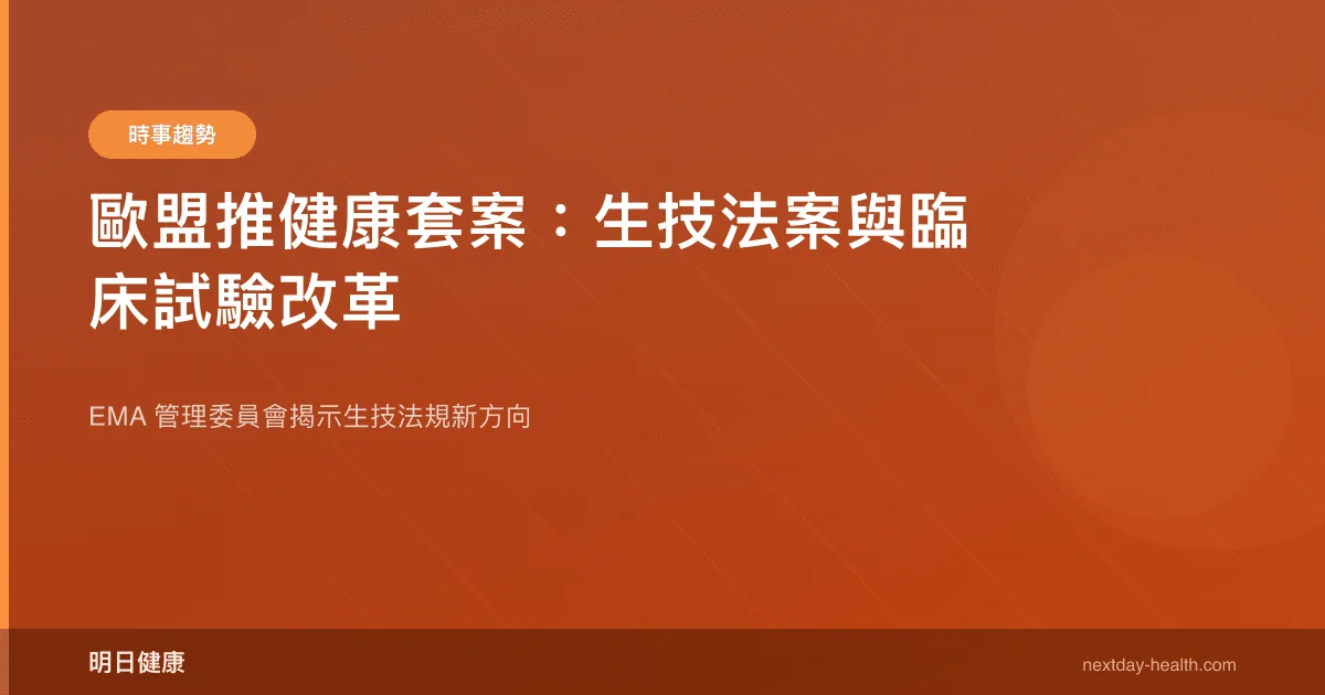 歐洲藥品管理局(EMA)管理委員會於 2026 年 3 月會議中揭示歐盟健康套案重點方向,包含首階段歐盟生技法案(EU Biotech Act)、臨床試驗法規修正案,以及醫療器材法規(MDR/IVDR)修訂。這一系列改革旨在強化歐洲生技競爭力,同時為患者帶來更快速、更安全的創新療法。