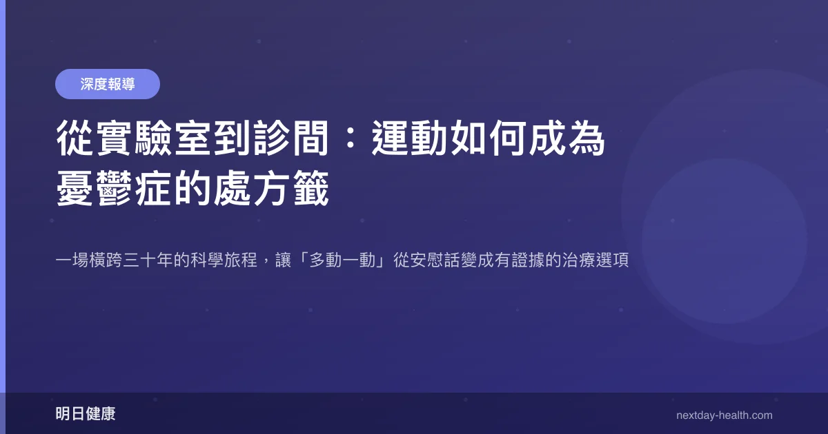 清晨六點半,台北市某醫學中心的精神科候診區,一名四十歲的工程師拿到了一張不太尋常的處方箋。上面寫的不是藥名,而是一週三次、每次三十分鐘的中等強度慢跑。他半信半疑地看著醫師,心裡想的和很多人一樣:運動真的能治療憂鬱嗎?