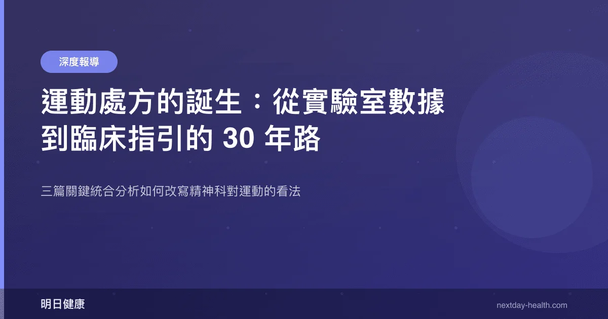 2024 年《英國醫學期刊》發表了一篇納入 218 項隨機對照試驗的網絡統合分析,結論直白得令人意外:規律散步對憂鬱的改善幅度,與服用抗憂鬱藥物相當。這不是小型先驅研究的樂觀宣告,而是 14,170 名受試者的數據彙整結果。從 1990 年代第一批「運動與情緒」的小型臨床試驗,到今天歐洲多國將運動正式納入精神科處方,這條路走了將近三十年。這篇報導追溯三篇關鍵統合分析,拼出運動從「有益身心」的常識,蛻變為有劑量、有效果量、有處方邏輯的臨床工具的過程。