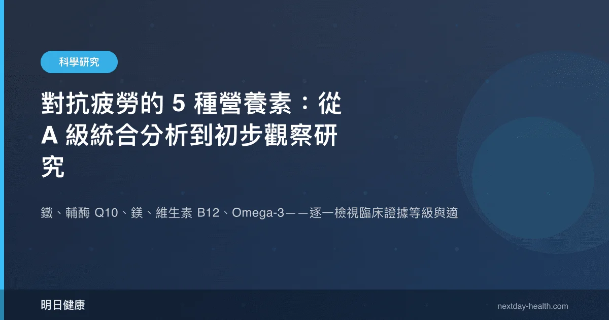 營養性疲勞是指因特定微量營養素不足或代謝失衡,導致身體能量產生效率下降的持續性倦怠狀態。臨床上,鐵缺乏、鎂不足、輔酶 Q10 濃度偏低均與疲勞感密切相關,而這些營養素恰好有層次不等的臨床試驗證據支持其補充效益。本文依據五項近年發表的系統性回顧與臨床研究,按證據等級從 A(統合分析)到 B(隨機對照試驗與觀察性研究),逐一檢視鐵、輔酶 Q10、Omega-3、鎂與維生素 B12 在疲勞相關生理機轉中的角色。