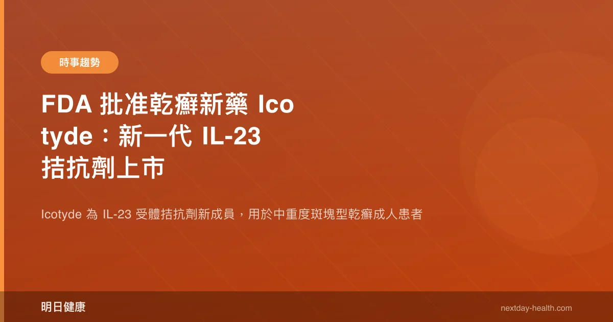 美國食品藥物管理局(FDA)於 2026 年 3 月 17 日批准 Icotyde(icotrokinra)用於治療適合全身性治療或光照治療的中重度斑塊型乾癬(plaque psoriasis)成人患者。Icotyde 是一種 IL-23 受體拮抗劑,透過阻斷介白素-23(interleukin-23)與其受體的結合,抑制驅動乾癬病灶的 Th17 免疫發炎路徑。