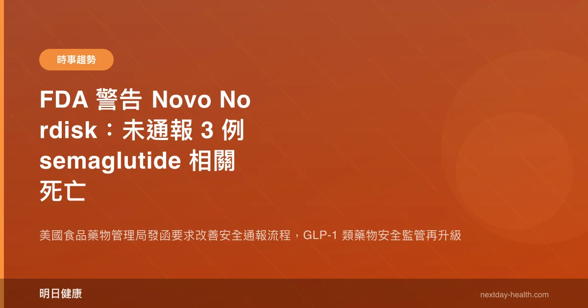 美國食品藥物管理局(FDA)於 2026 年 3 月向丹麥藥廠 Novo Nordisk 發出警告信,指出該公司未依法通報 3 例與 semaglutide(司美格魯肽)相關的死亡案例,同時未充分揭露該藥物的潛在風險。Semaglutide 是目前全球最暢銷的 GLP-1 受體促效劑,以 Ozempic(糖尿病適應症)及 Wegovy(減重適應症)等品牌名在市場上銷售,全球使用人數已超過數千萬。