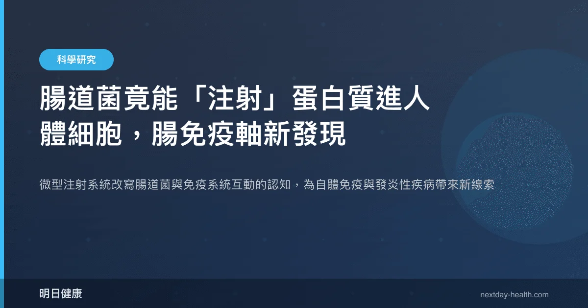 腸道菌群與人體免疫系統的溝通方式比過去認知的更為直接。最新研究揭示,腸道中的共生細菌擁有微型注射系統,能將特定蛋白質「注射」進人體腸道細胞,直接影響免疫反應的啟動與調節。這項發現跳脫了傳統「代謝產物中介」的理解框架,為腸道免疫軸(gut-immune axis)的研究開啟了全新維度。(本研究為基礎科學發現,尚需更多人體研究驗證)