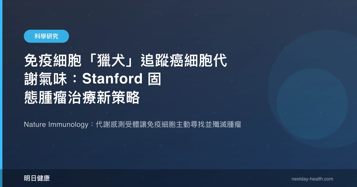 Stanford 醫學院研究團隊在《Nature Immunology》發表創新研究:為免疫細胞裝上能感測癌細胞代謝副產物的受體,讓它們像「獵犬追蹤氣味」一樣主動尋找、浸潤並消滅固態腫瘤。這種方法在乳癌和卵巢癌小鼠模型中顯著延長了存活期。