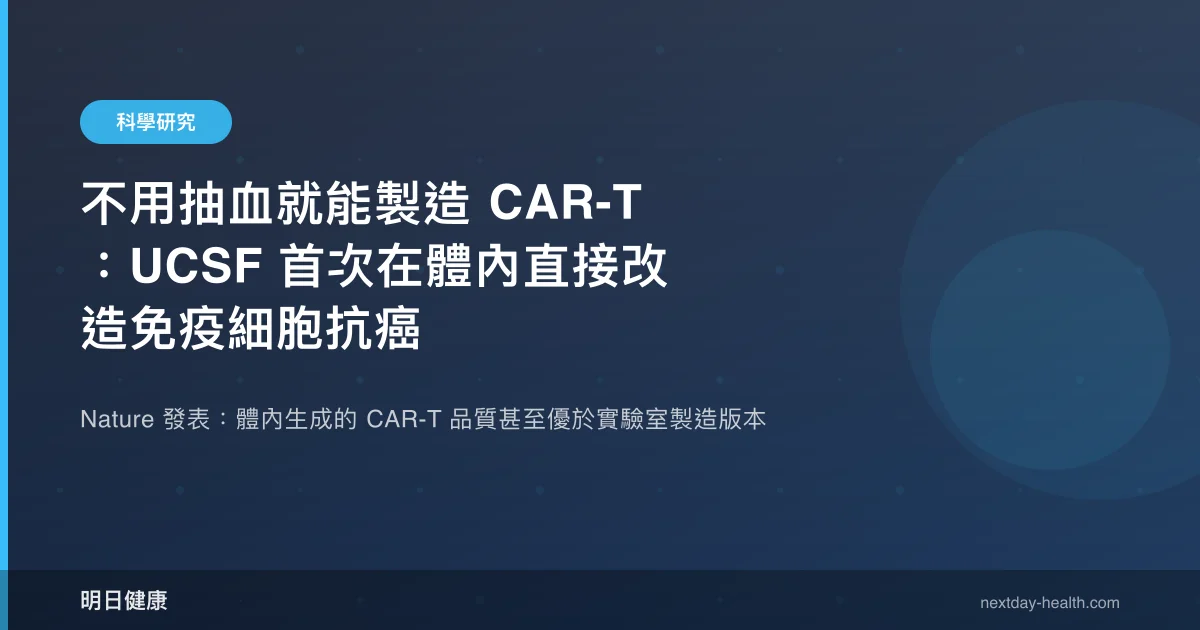 加州大學舊金山分校(UCSF)研究團隊在《Nature》發表突破性成果:首次成功將大段 DNA 序列精準插入人體內的 T 細胞特定位點,不需要將免疫細胞抽出體外培養,就能在體內直接生成 CAR-T 細胞對抗癌症。