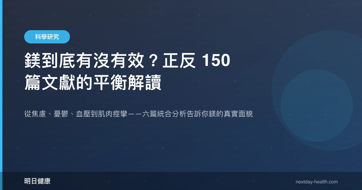 鎂是人體第四豐富的礦物質,參與超過 300 種酵素反應,但全球約有 50% 的人攝取量未達建議標準。近年來,鎂補充品在健康市場異軍突起,宣稱能改善睡眠、緩解焦慮、降低血壓——這些說法究竟有多少科學根據?本文彙整六篇高品質統合分析(meta-analysis),涵蓋焦慮、憂鬱、血壓、偏頭痛、睡眠與肌肉痙攣六大面向,為你呈現鎂的真實療效光譜:哪些領域證據堅實,哪些仍有待商榷。