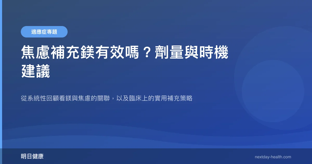 - 兩篇系統性回顧均顯示鎂補充可降低自評焦慮分數,輕至中度焦慮改善較一致