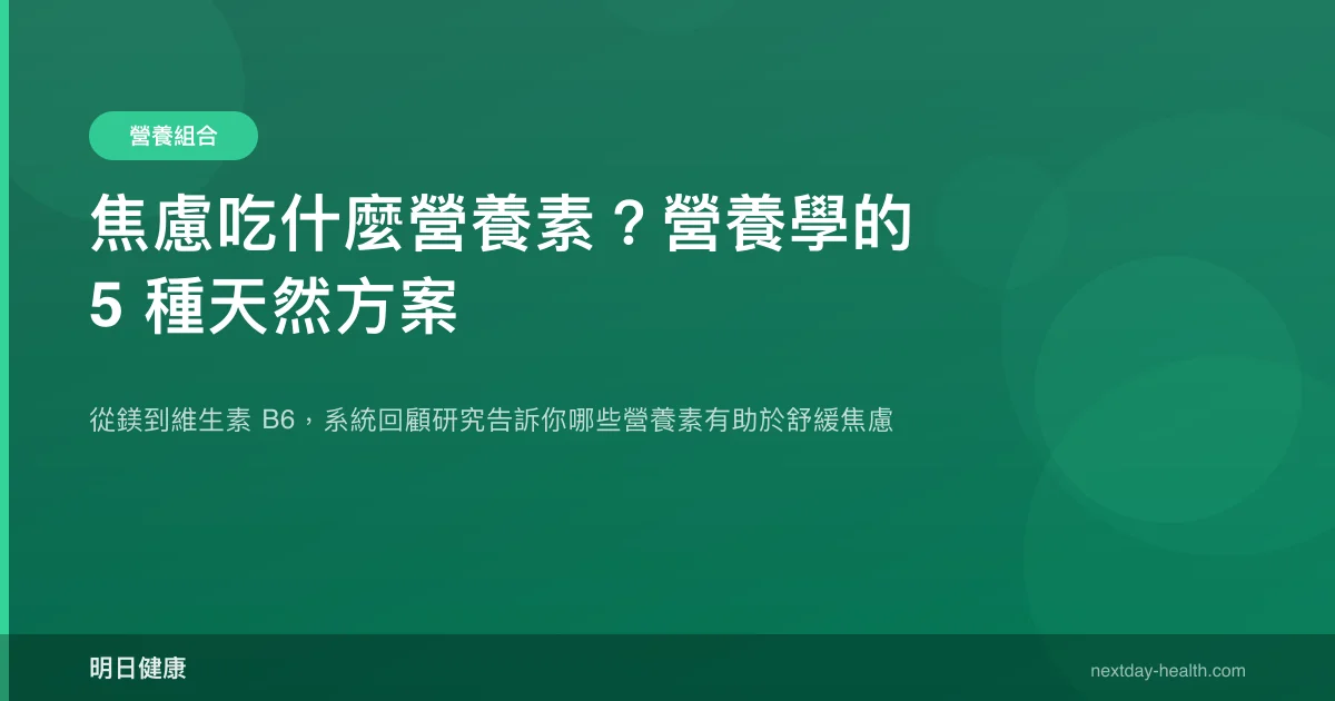 本文從實證角度出發,整理五種與焦慮管理相關的天然營養方案,每一項都有臨床研究支持。需要強調的是,營養補充是輔助策略,不能取代專業心理或精神科治療。