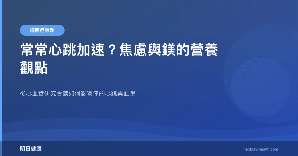 也就是說,鎂不是解決焦慮或心悸的萬用方案。如果你的心悸頻繁發作或伴隨胸痛、暈眩,請先諮詢醫師排除心臟疾病。