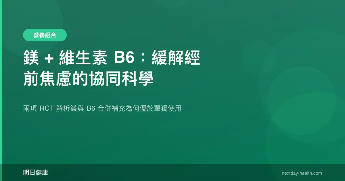 每日 200mg 鎂搭配 50mg B6 連續 1 個月,對焦慮相關經前症狀的緩解效果顯著優於單獨補充鎂或單獨補充 B6(De Souza et al., 2000)。這項隨機對照試驗將受試者分為四組:鎂+B6 組、單獨鎂組、單獨 B6 組與安慰劑組,結果顯示合併組在焦慮量表上的改善幅度最大,且達到統計顯著性。