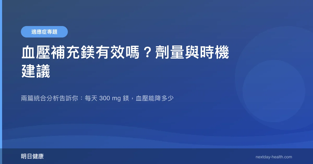 2016 年發表於《Hypertension》的統合分析(Zhang 等人,PMID: 27402922)納入了多項隨機雙盲安慰劑對照試驗,結果發現鎂補充可顯著降低收縮壓約 2 mmHg 與舒張壓約 1.78 mmHg。劑量反應分析進一步指出,每日 300 mg 元素鎂即可達到統計上顯著的降壓效果,且補充時間達三個月以上時效果更為穩定。