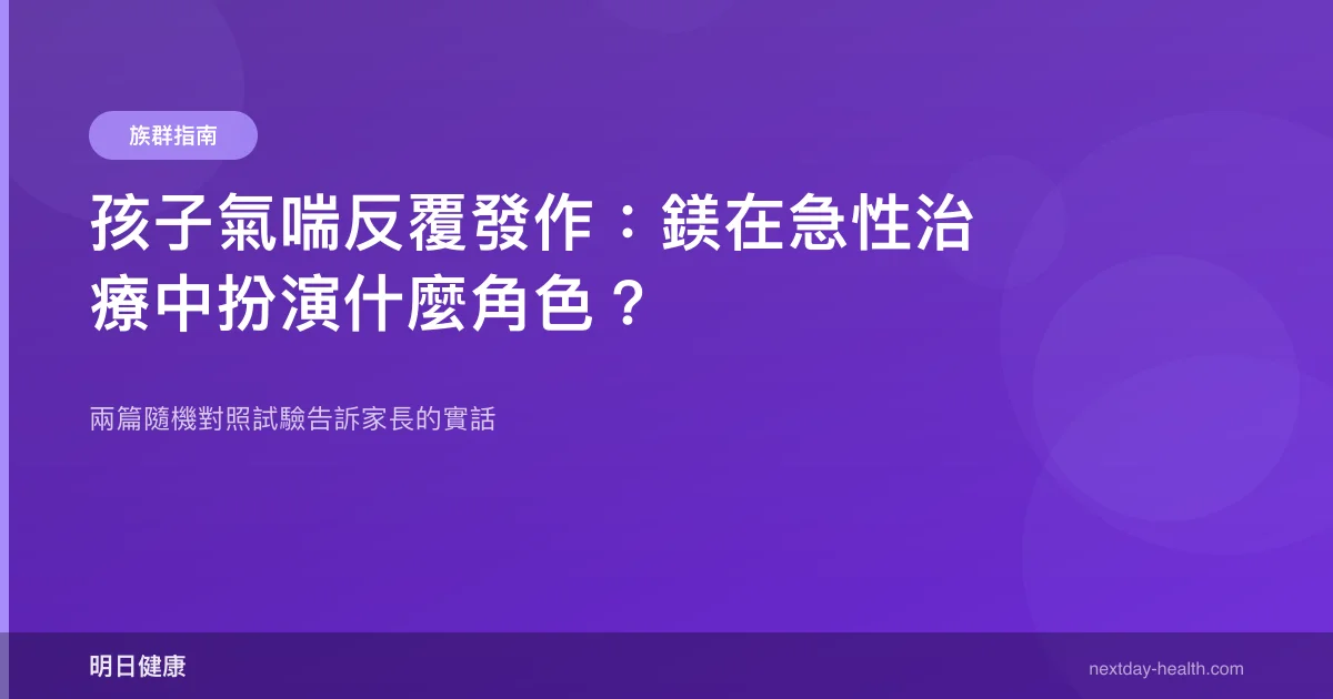 「孩子又喘起來了」——這句話對氣喘兒的家長來說,每一次都像警報。當常規的支氣管擴張劑效果不夠好,醫師可能會提到「硫酸鎂」這個選項。鎂,這個我們日常飲食中就能攝取的礦物質,真的能在孩子呼吸困難時幫上忙嗎?兩篇高品質的隨機對照試驗(RCT)給了我們比較清晰的答案。