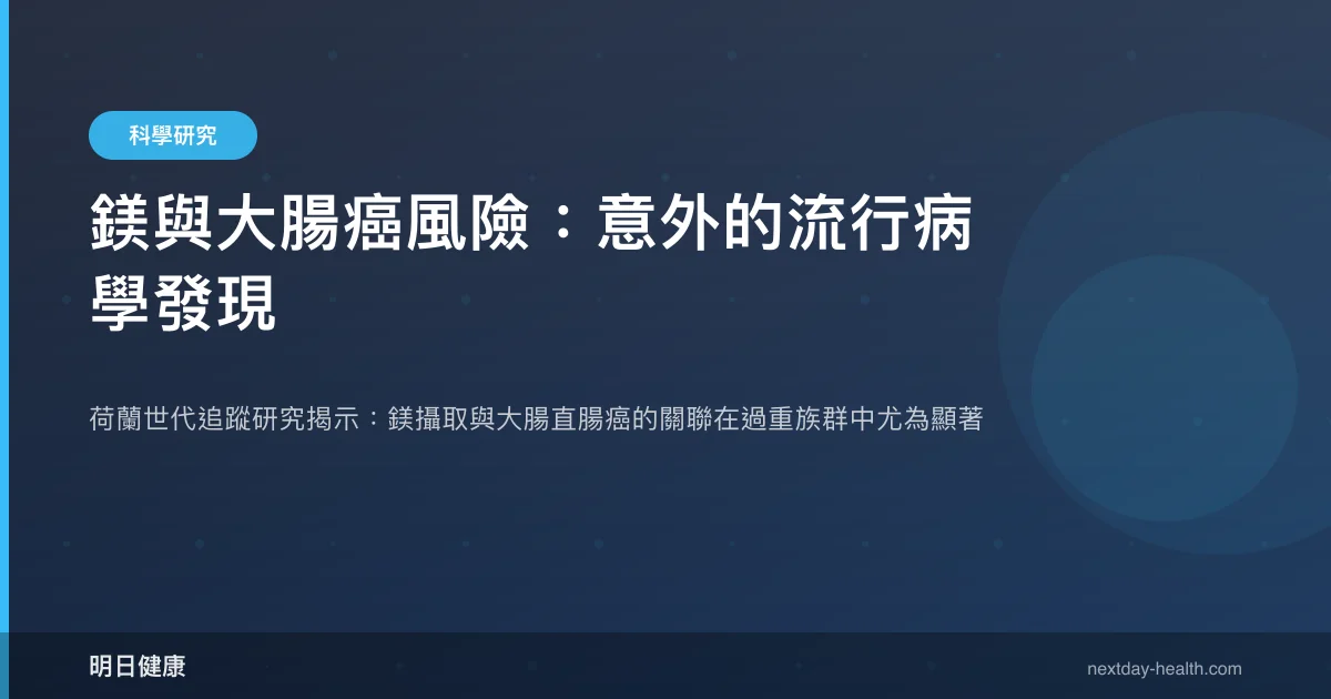 一項追蹤超過 12 萬人的荷蘭世代研究發現,鎂攝取量與大腸直腸癌風險之間存在負相關趨勢,而這種保護性關聯在過重者中更為明顯——結腸癌的趨勢 P 值達 0.05,近端結腸癌更低至 0.02。這項發表於《British Journal of Cancer》的研究,為理解礦物質與消化道癌症的關係開啟了新的視角。