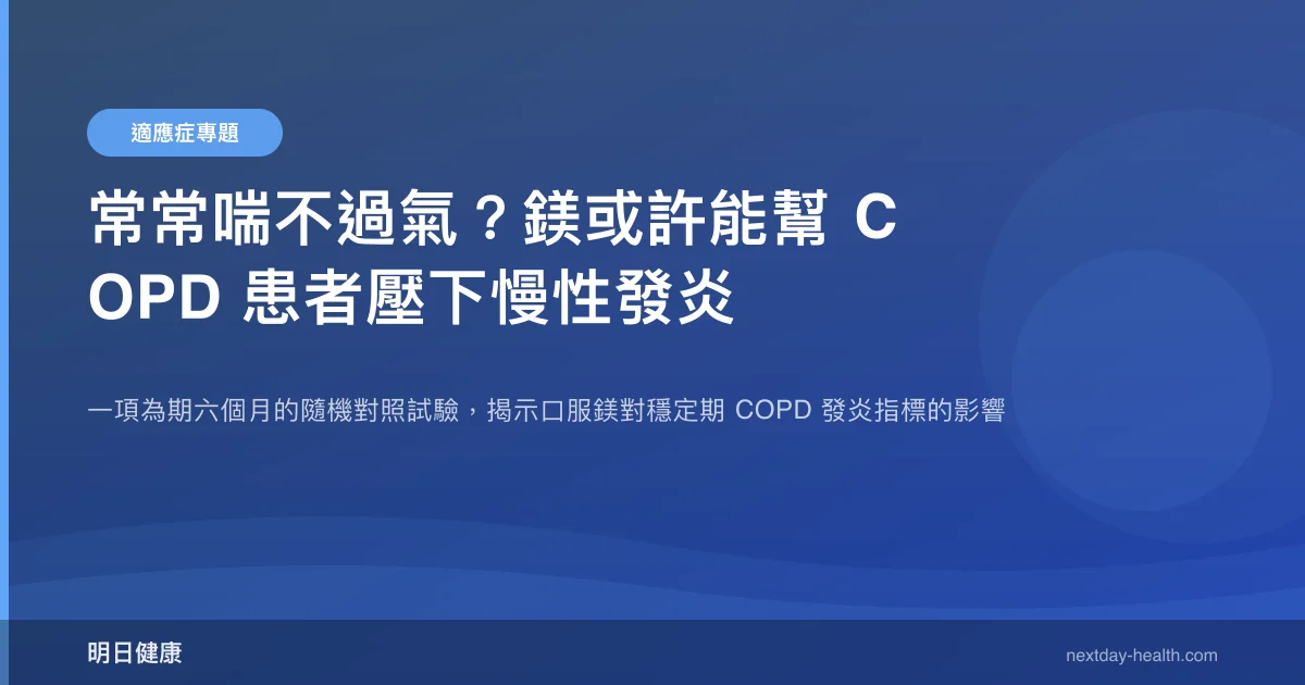 你可能聽過鎂對睡眠、情緒有幫助,但比較少人知道,這個平凡的礦物質正在慢性阻塞性肺病(COPD)的研究中引起關注。COPD 不只是「肺不好」這麼簡單——它是一種全身性慢性發炎疾病,而發炎指標 CRP 居高不下,往往預示著病情惡化與住院風險升高。