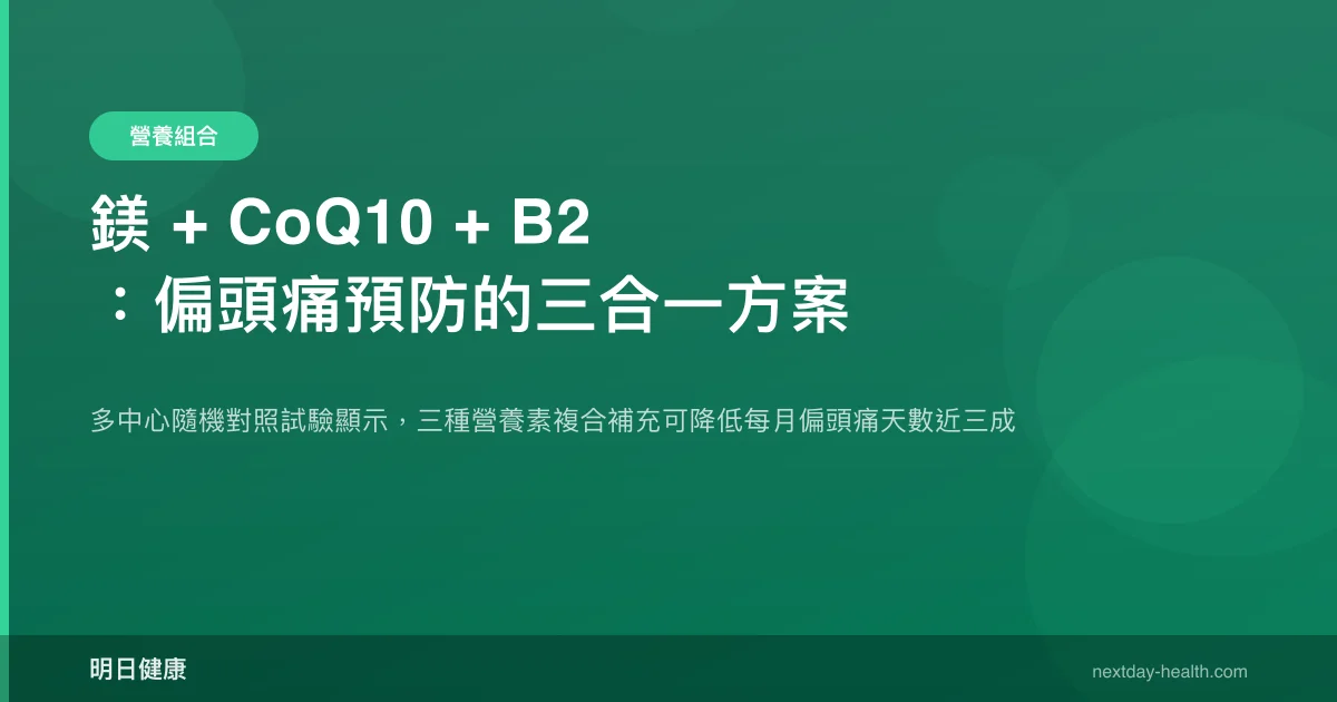一項多中心隨機對照試驗發現,同時補充鎂、輔酶 Q10(CoQ10)與維生素 B2(riboflavin)的複合配方,可將每月偏頭痛天數從 6.2 天降至 4.4 天,降幅達 29%,顯著優於安慰劑組的 16% 降幅。這項研究為營養素組合預防偏頭痛提供了迄今最具說服力的臨床證據之一。