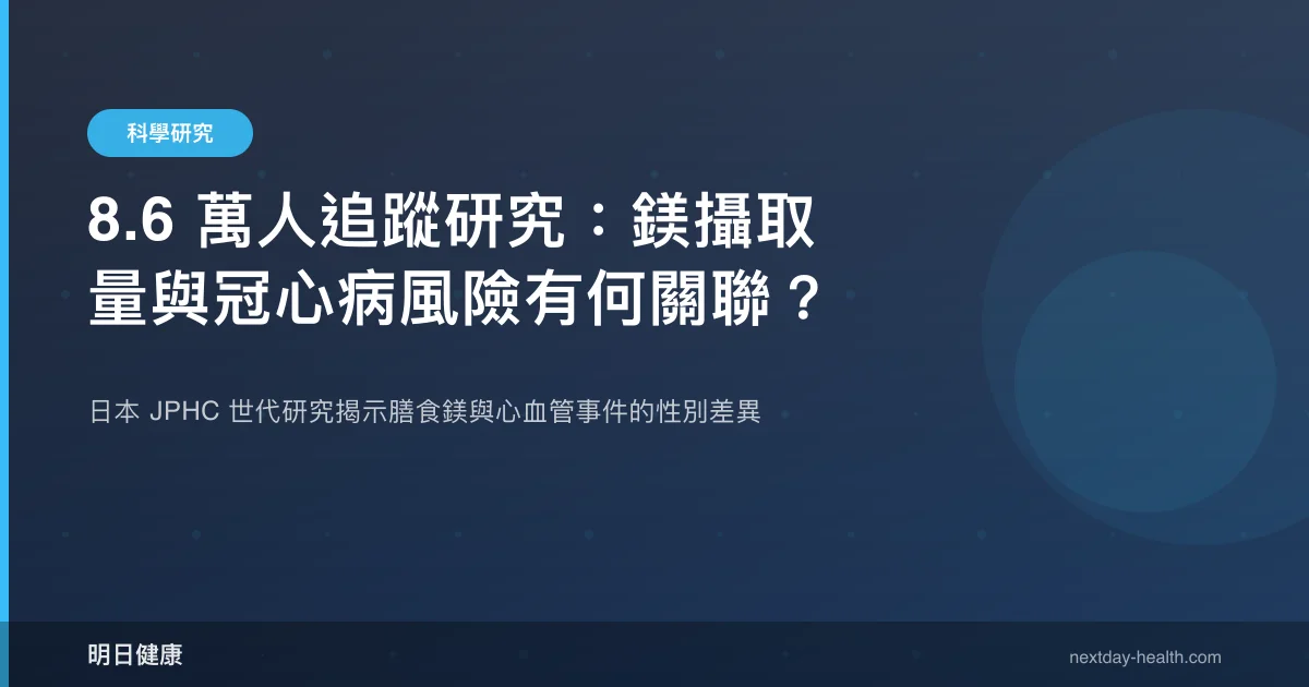 日本 JPHC(Japan Public Health Center-based Prospective Study)研究正好填補了這個缺口——這是一項追蹤超過 8.6 萬名日本成年人的長期世代研究,專門探討膳食鎂攝取量與冠心病、中風風險的關聯。