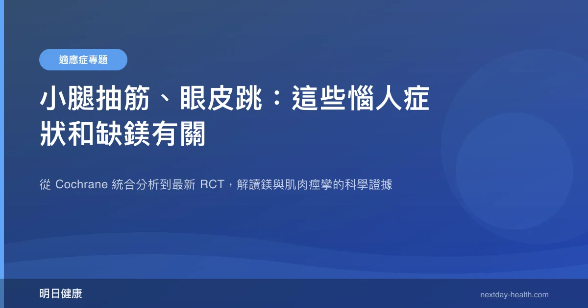 半夜小腿突然抽筋痛醒、開會時眼皮不受控地跳個不停——這些看似無害卻惱人的症狀,背後可能藏著同一個營養缺口:鎂。根據 2020 年 Cochrane 系統性回顧,鎂補充對一般成人夜間腿部痙攣的改善證據確定性偏低,但一項 2021 年多中心 RCT 卻發現鎂治療組的抽筋頻率顯著下降(3.4 次降至 2.6 次,p=0.01)。科學界對鎂與痙攣的關係仍有爭論,本文帶你看懂正反兩面的證據。