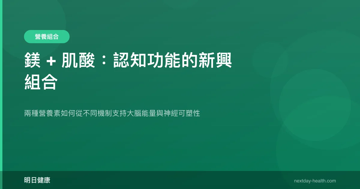 所謂「認知功能的新興組合」,指的是將鎂的神經保護與突觸調控能力,結合肌酸的細胞能量緩衝功能,從兩個維度同時支持大腦運作。這個概念目前仍處於早期探索階段,尚缺乏兩者合併使用的大型臨床試驗。