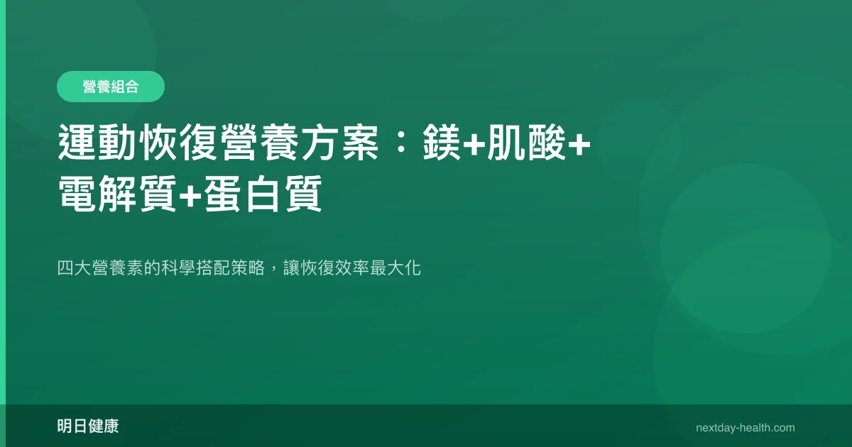 每次高強度訓練後,你是否覺得肌肉痠痛遲遲不退、下一次練習表現打折?研究顯示,單一營養素的補充往往不夠——鎂、肌酸、電解質與蛋白質四者協同運作,才能從能量代謝、肌肉修復到水合平衡全面覆蓋恢復需求。本指南以 Step-by-Step 方式,帶你建立一套有實證基礎的運動恢復營養方案。