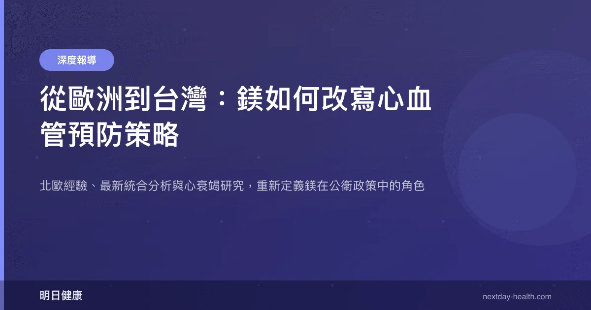 從健保永續的角度思考,高血壓與心衰竭是醫療支出的兩大重擔。如果每日不到 10 元新台幣的鎂補充,就能為高風險族群帶來有意義的血壓改善與心血管保護,這筆帳值得精算。北歐模式不是直接套用的範本,但「以營養政策降低慢性病負擔」的思維框架,確實值得台灣借鏡。