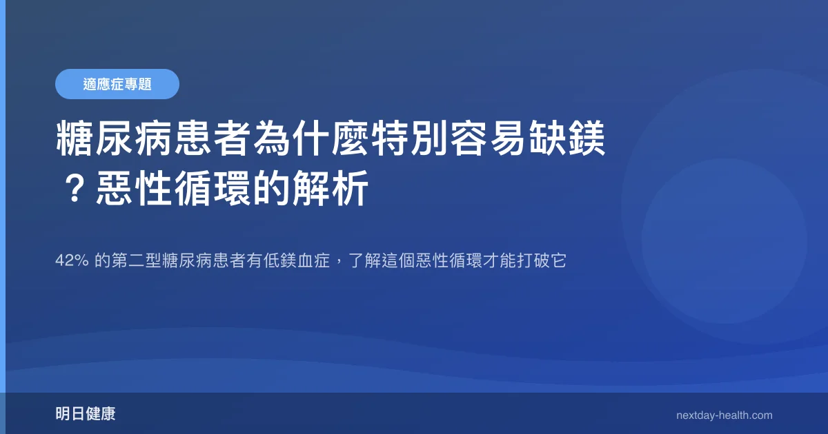 這形成了第三層惡性循環:糖尿病損傷腎臟 → 腎臟無法保留鎂 → 鎂缺乏加重胰島素阻抗和發炎 → 血糖控制惡化 → 腎臟損傷加劇。對於已有腎病變的糖尿病患者,鎂的監測和補充需要格外謹慎,因為晚期腎病患者反而可能出現高鎂血症的風險,補充劑量必須由腎臟科醫師依腎功能調整。