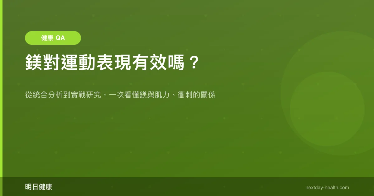 統合分析顯示:可以,但效果因人而異。Wang 等人(2017)彙整多項研究後發現,補充鎂能顯著改善握力與腿部力量,尤其在老年人族群中效果最明顯——原因很可能是他們基線鎂狀態本來就偏低。不過,對於鎂攝取已經足夠的運動員來說,額外補充的效益就沒那麼一致了,這是一個重要的研究限制。換句話說,缺鎂的人補了有感,不缺的人補了可能沒差。