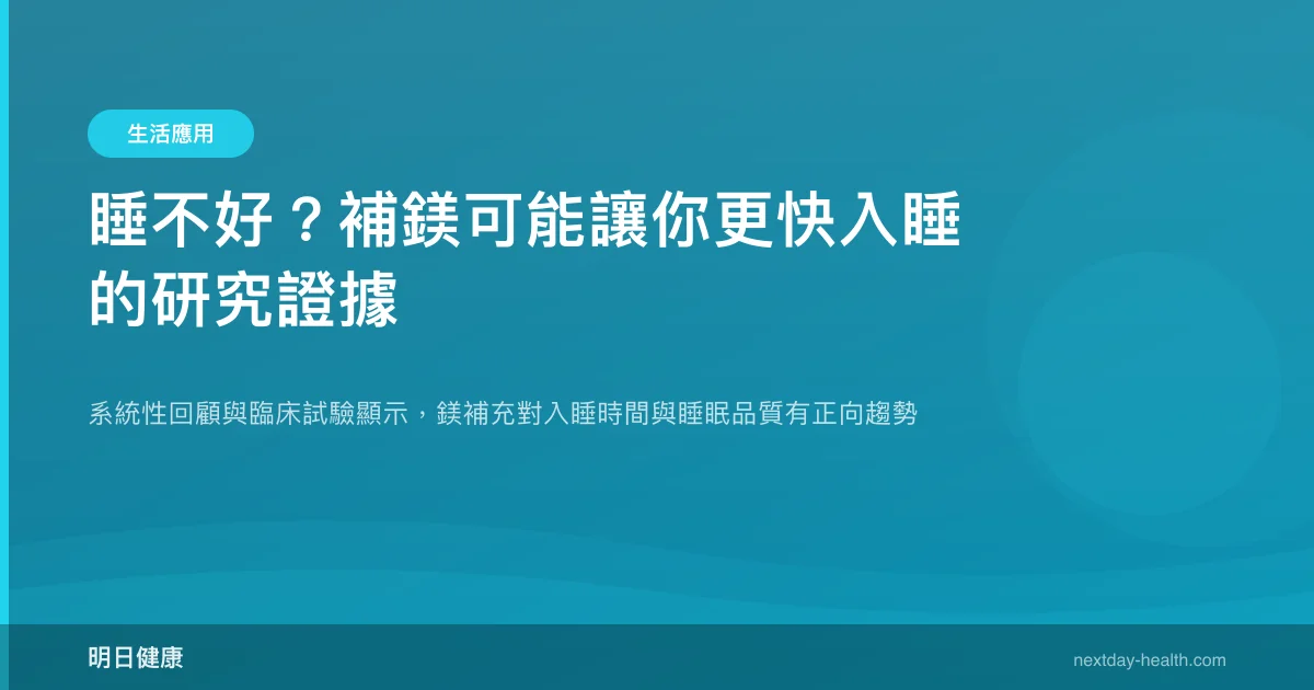 - 系統性回顧發現,補充鎂可使入睡潛伏期縮短約 17 分鐘,但整體證據確定性為低至中等。