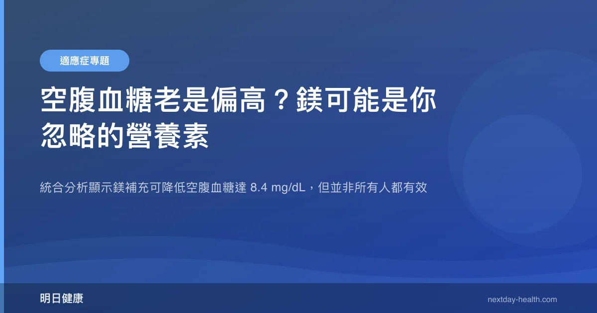 空腹血糖反覆偏高,除了飲食和運動,你可能忽略了一個關鍵礦物質——鎂。一項涵蓋多篇隨機對照試驗的統合分析顯示,口服鎂補充可讓空腹血糖平均下降 8.40 mg/dL,對糖化血色素(HbA1c)與胰島素阻抗指數(HOMA-IR)也有顯著改善。然而,最新研究也提醒我們:對於已在使用胰島素的第二型糖尿病患者,鎂的效果可能不如預期。這篇文章整理三篇高品質文獻,帶你了解鎂與血糖控制的最新科學證據。