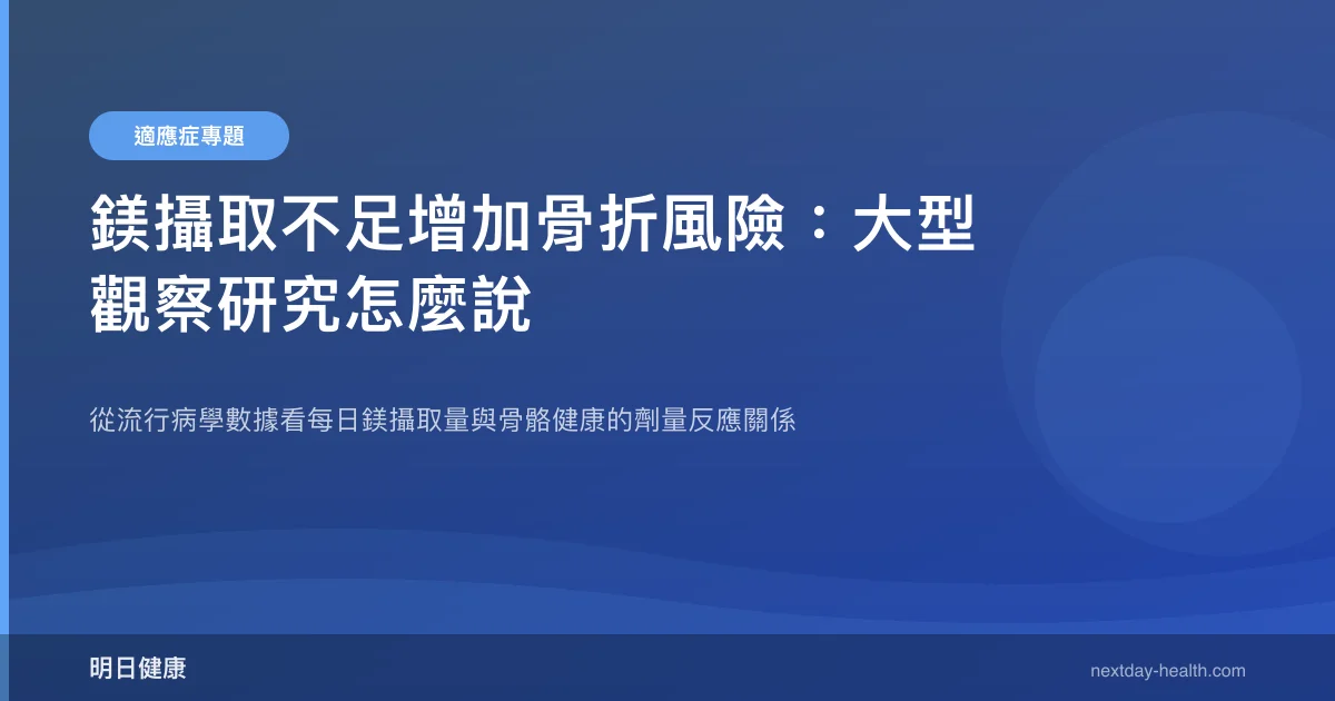目前的觀察性研究和統合分析顯示,充足的鎂攝取與較低的骨折風險有關,尤其是髖部骨折。但因為缺乏大型隨機對照試驗,尚不能確定補鎂「直接」預防骨折。建議先從飲食調整做起,確保每日攝取量達標。