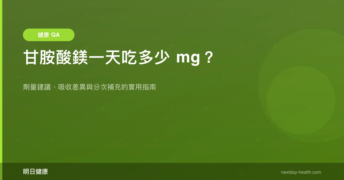 一般成人每日元素鎂建議攝取量為 310–420 mg,而甘胺酸鎂(magnesium bisglycinate)因含鎂比例約 14%,換算下來每日補充劑量通常落在 200–400 mg 的元素鎂範圍。一篇系統性回顧指出,有機鎂鹽如甘胺酸鎂的生物利用度顯著優於無機型態,且胃腸副作用較少(Pardo et al., 2021)。不過要注意,這裡說的是「元素鎂」含量,不是膠囊上標示的甘胺酸鎂總重量——買之前記得看清楚標示。