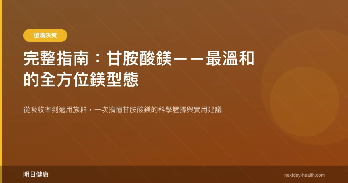 甘胺酸鎂(Magnesium Glycinate)是鎂與甘胺酸結合的螯合型態,因吸收率高且胃腸副作用最少,被研究者視為最溫和的鎂補充選擇。系統性回顧指出,有機鎂鹽的生物利用度顯著優於無機鎂鹽,而甘胺酸鎂在所有型態中胃腸耐受性表現最佳(Pardo et al., 2021)。本指南整理現有科學證據,幫助你判斷甘胺酸鎂是否適合自己。