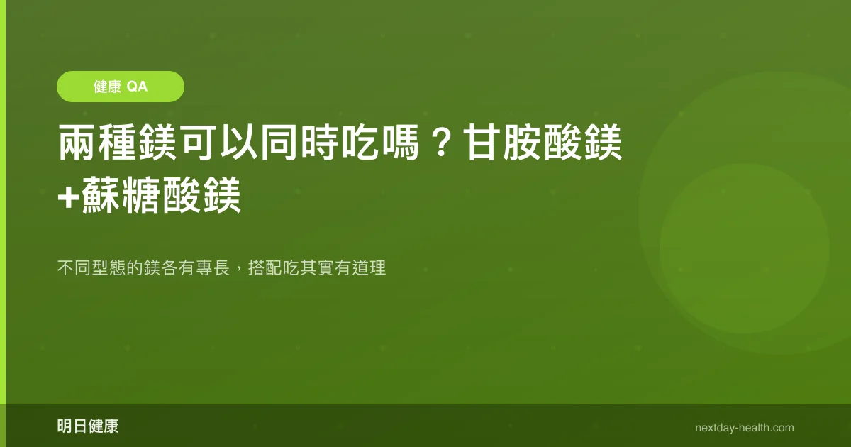 關鍵是看「元素鎂總量」。成人每日鎂的建議攝取量約 310-420 mg,補充劑的安全上限(UL)為 350 mg。兩種一起吃時,要把兩者提供的元素鎂加總計算,不要超標。研究也發現,分次小劑量的總吸收率優於單次大劑量,所以建議早晚各一種、隨餐服用,效果更好。
