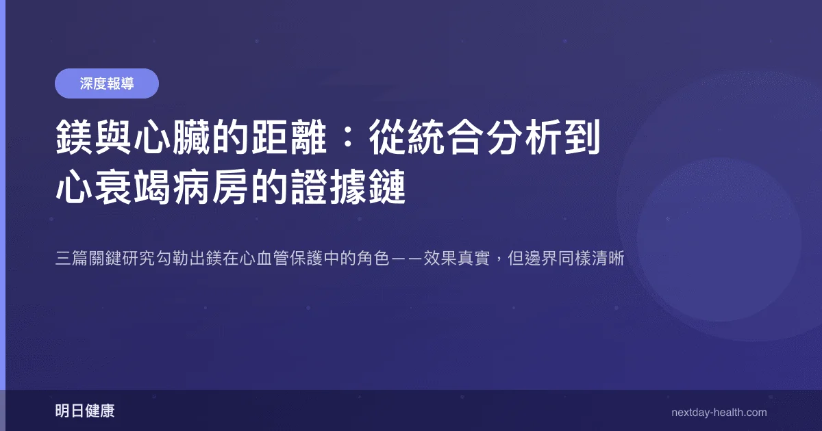 三項研究從不同角度勾勒出一致的方向:維持足夠的鎂攝取或血清鎂濃度,與較好的心血管結局有關。統合分析提供了降壓的因果證據,觀察性研究補充了長期死亡率的關聯數據,而心衰竭試驗則揭示了鎂與現代藥物的交互效應。