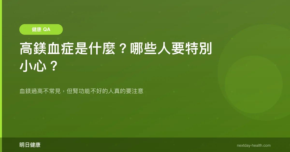 高鎂血症就是血液中鎂離子濃度超過正常值(通常 > 2.6 mg/dL),雖然在一般人身上很少見,但在腎功能受損的患者中發生率明顯升高。簡單說:腎臟是身體排鎂的主要管道,腎臟罷工,鎂就容易堆積。