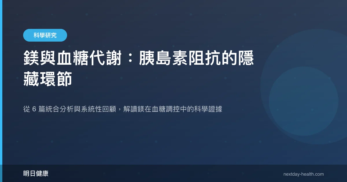 Verma 與 Garg(2017)的研究同樣觀察到鎂對糖尿病相關心血管風險因子(血壓、血脂)有輔助改善效果。這些發現呼應了一個更宏觀的觀點:鎂在代謝健康中的角色不侷限於單一指標,而是跨越血糖、血壓與脂質代謝的多面向影響。