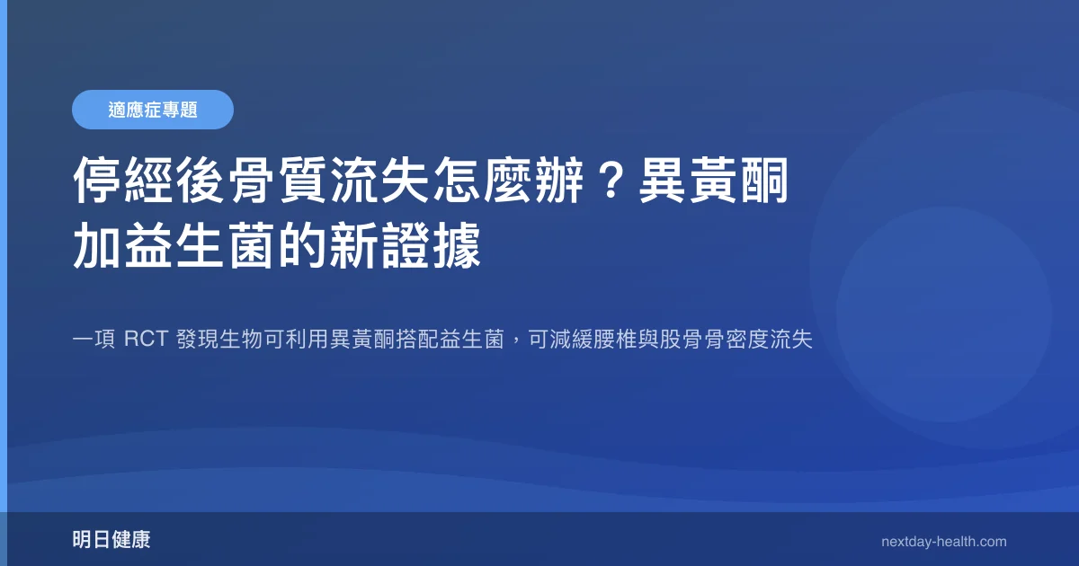 生物可利用異黃酮結合益生菌可顯著減緩停經後骨質疏鬆前期女性的腰椎與股骨骨密度流失(Lambert et al. 2017, PMID: 28768651)。這項隨機對照試驗(RCT)針對停經後骨量減少的女性,比較了異黃酮加益生菌組合與安慰劑的效果。