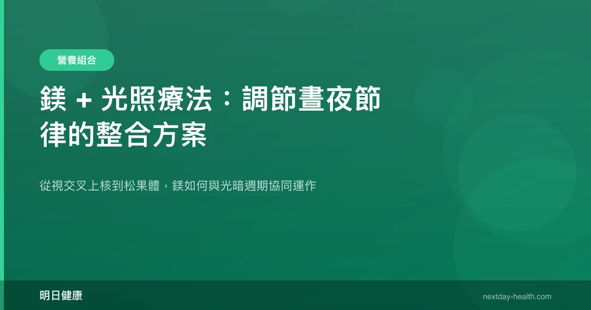 光照療法透過視網膜感光細胞將光線訊號傳入 SCN,重設內在時鐘與外在環境的同步;鎂則從細胞層級支撐這條訊號鏈的完整性。理解兩者的協同機轉,有助於建構更全面的晝夜節律調節策略。