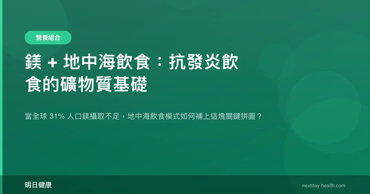 全球約 24 億人(約 31% 的世界人口)未達到建議的鎂攝取量,而鎂缺乏已被證實會促進體內 NF-κB 路徑活化,進而推升促發炎細胞因子 IL-6 與 TNF-α 的釋放(Zhang et al., 2025)。地中海飲食長期被視為抗發炎飲食的黃金標準,但多數討論聚焦在橄欖油中的多酚或魚類的 omega-3 脂肪酸,卻鮮少提及這套飲食模式天然富含鎂的特性。事實上,深綠色蔬菜、堅果、全穀物與豆類——這些地中海飲食的核心食材——正是膳食鎂的主要來源。