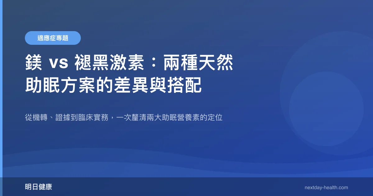 - 鎂透過調節 GABA 受體和放鬆肌肉來促進入睡,褪黑激素則透過校準生理時鐘發揮作用,兩者機轉互補