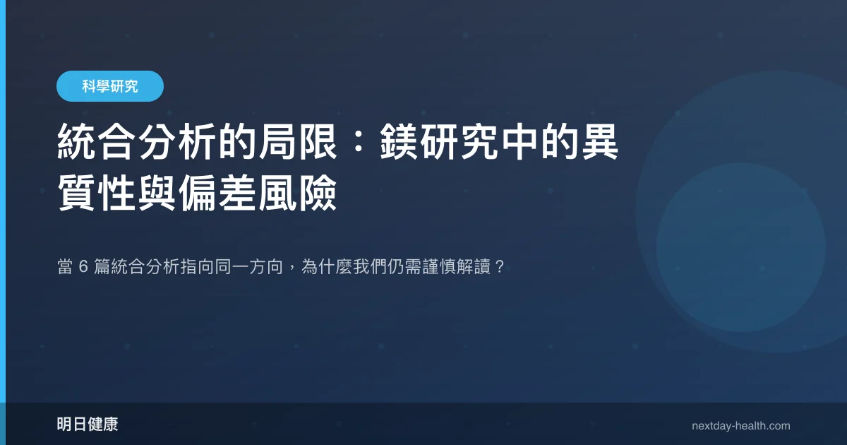 鎂補充的統合分析在焦慮、憂鬱、血壓、偏頭痛、睡眠與血糖六大領域均顯示正向效果,但這些研究的異質性(I² 值)普遍偏高,提醒我們正向結論背後存在不可忽視的方法學限制。本文檢視 6 篇高證據等級統合分析,拆解異質性來源與偏差風險,幫助讀者建立更精準的證據判讀能力。